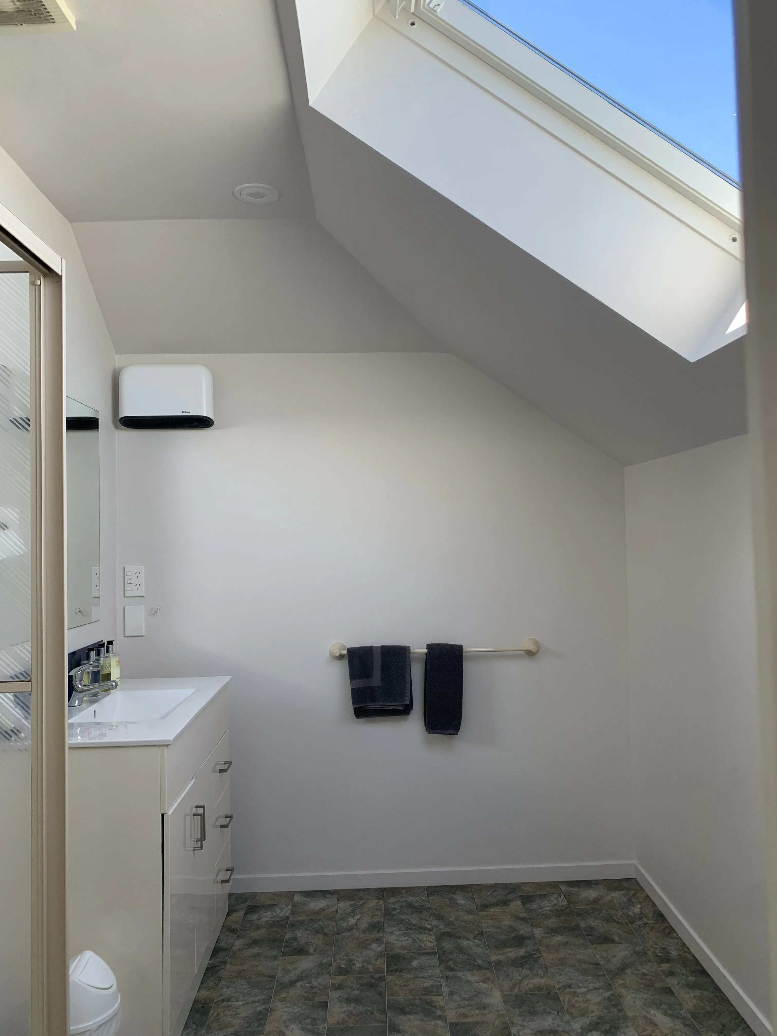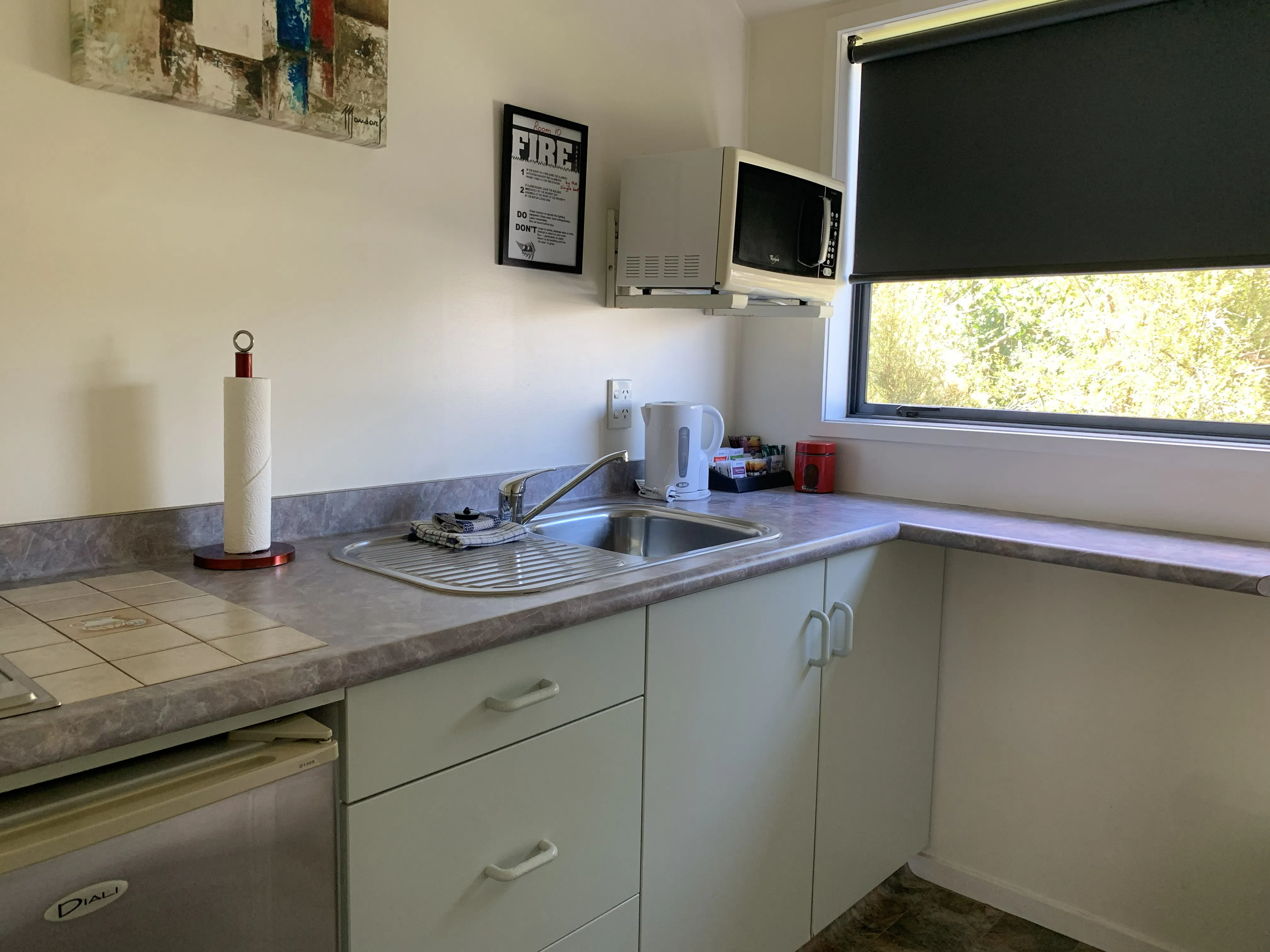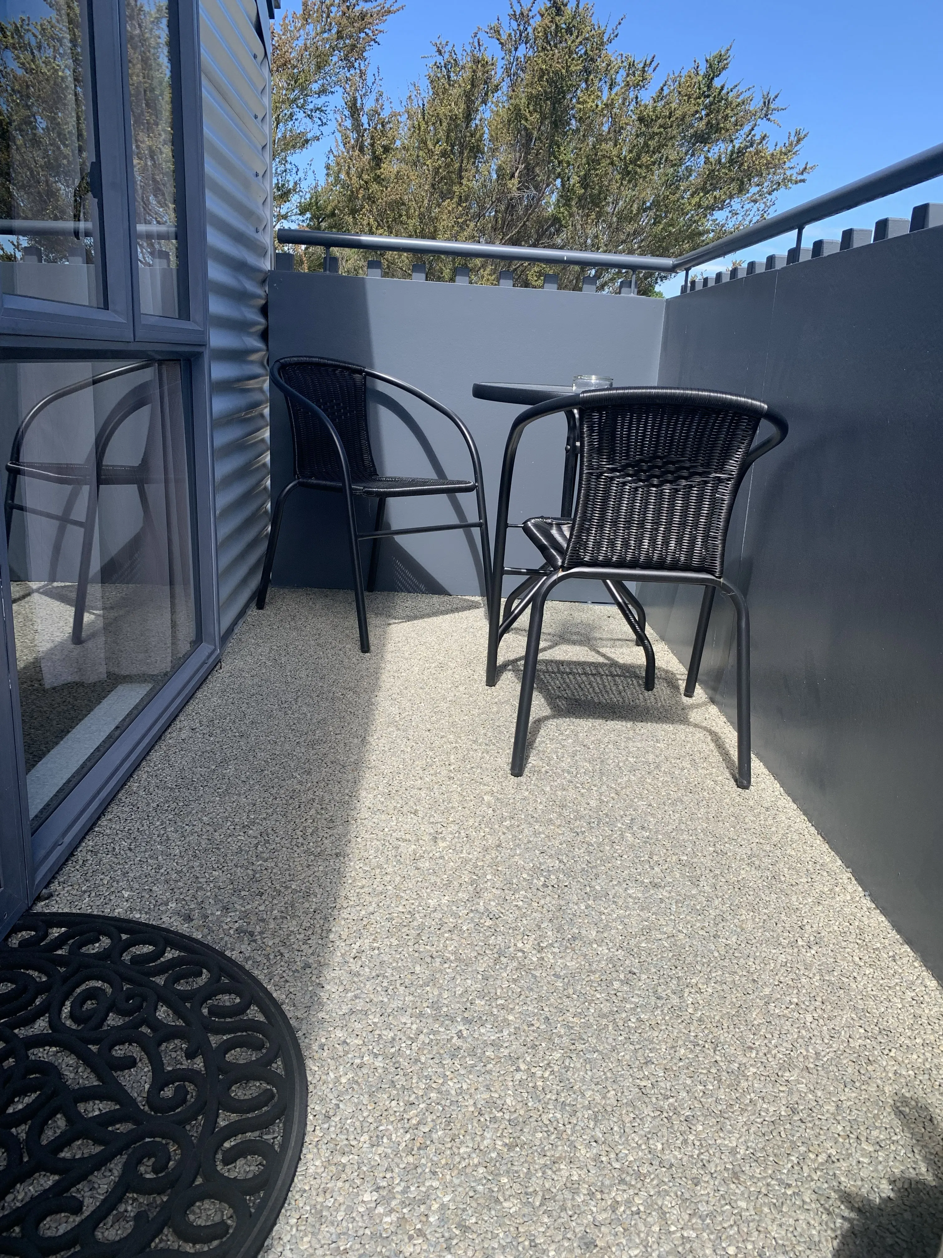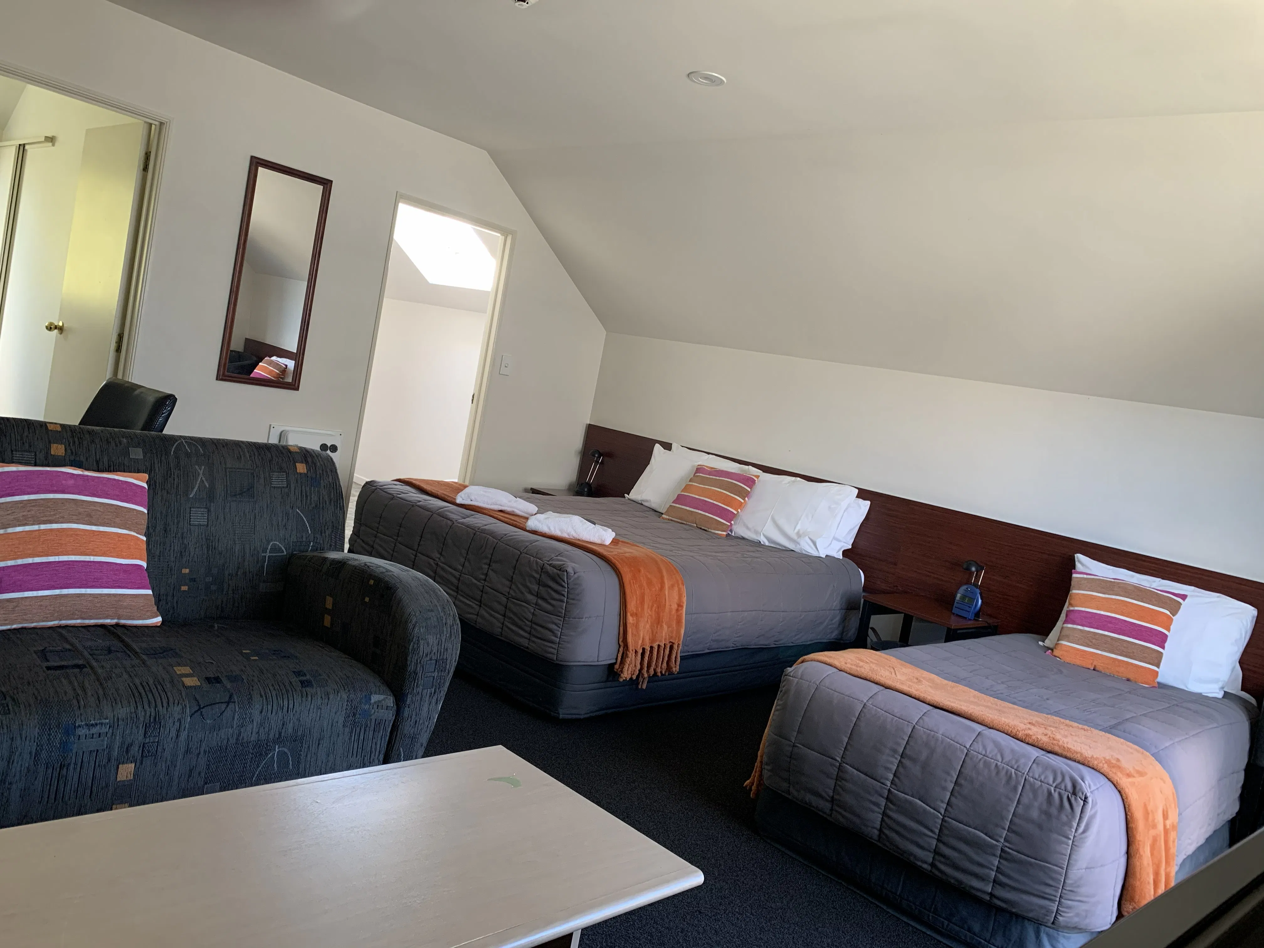 Spacious studio with a queen and single bed, lounge and dining area. The bathroom is large and has a double shower. The unit has a separate kitchen and is situated at the back of the complex and accessed by its’ own staircase, this unit offers peaceful privacy.